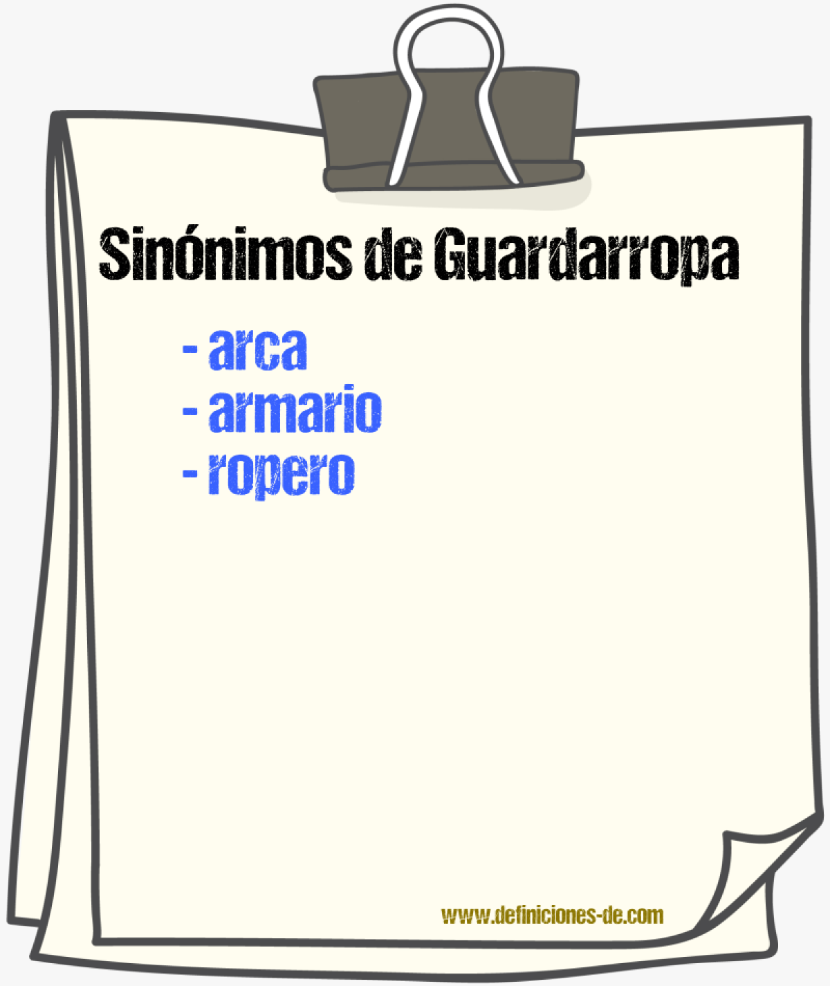 Definiciones-de.com (2017). Sinónimos de «guardarropa» - ALEGSA © 15/07/2017 url: https://www.definiciones-de.com/Sinonimos/de/guardarropa.php