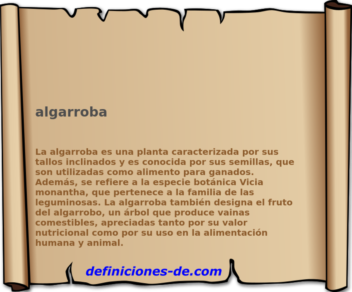Más abreviaturas...Cómo citar la definición de algarrobaDefiniciones-de.com (2010). Definición de algarroba - Leandro Alegsa © 14/09/2010 url: https://www.definiciones-de.com/Definicion/de/algarroba.php