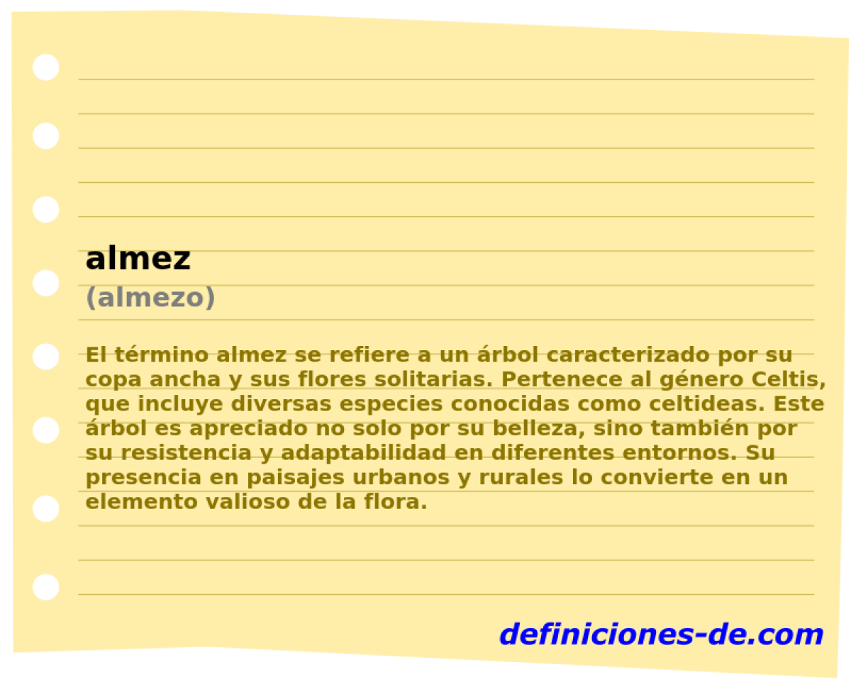 El término almez se refiere a un árbol caracterizado por su copa ancha y sus flores solitarias.