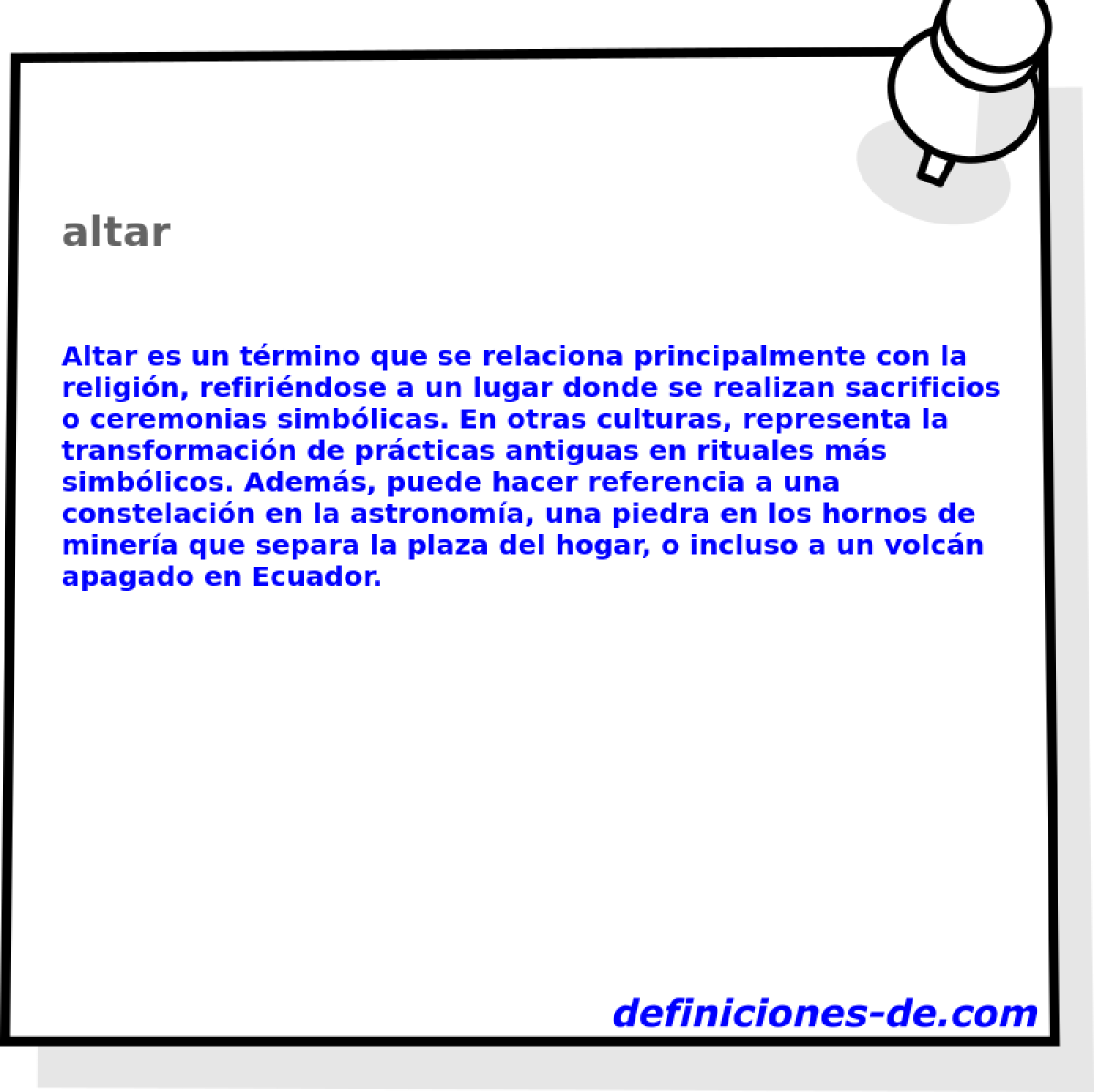 Más abreviaturas...Cómo citar la definición de altarDefiniciones-de.com (2020). Definición de altar - Leandro Alegsa © 20/06/2020 url: https://www.definiciones-de.com/Definicion/de/altar.php