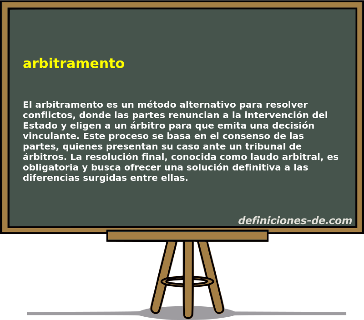 Más abreviaturas...Cómo citar la definición de arbitramentoDefiniciones-de.com (2013). Definición de arbitramento - Leandro Alegsa © 01/08/2013 url: https://www.definiciones-de.com/Definicion/de/arbitramento.phpEjemplos de utilización de la palabra arbitramento en noticias de la web- El Nuevo Siglo (Colombia) - "IDU ganó pleito en tribunal de arbitramento. Artículo | Julio 26, 2013 - 10:47pm. Un nuevo tribunal de arbitramento en el que estaban en juego cerca de 7.000 millones de pesos, ganó el Instituto de Desarrollo Urbano (IDU) a la sociedad Colombo-Hispánica."