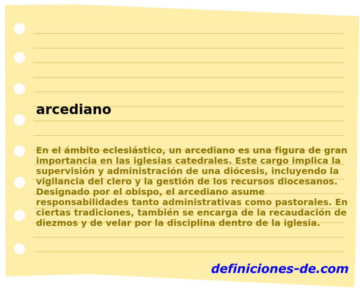 En la jerarquía eclesiástica, el arcediano es el principal responsable de la administración de una diócesis o iglesia catedral. Se encarga de supervisar la conducta y el desempeño del clero, así como de administrar los bienes de la diócesis.