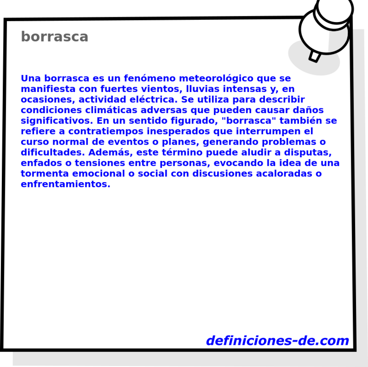 En su acepción más literal, "borrasca" se refiere a un fenómeno meteorológico caracterizado por fuertes vientos, lluvias intensas, y en ocasiones, actividad eléctrica.
