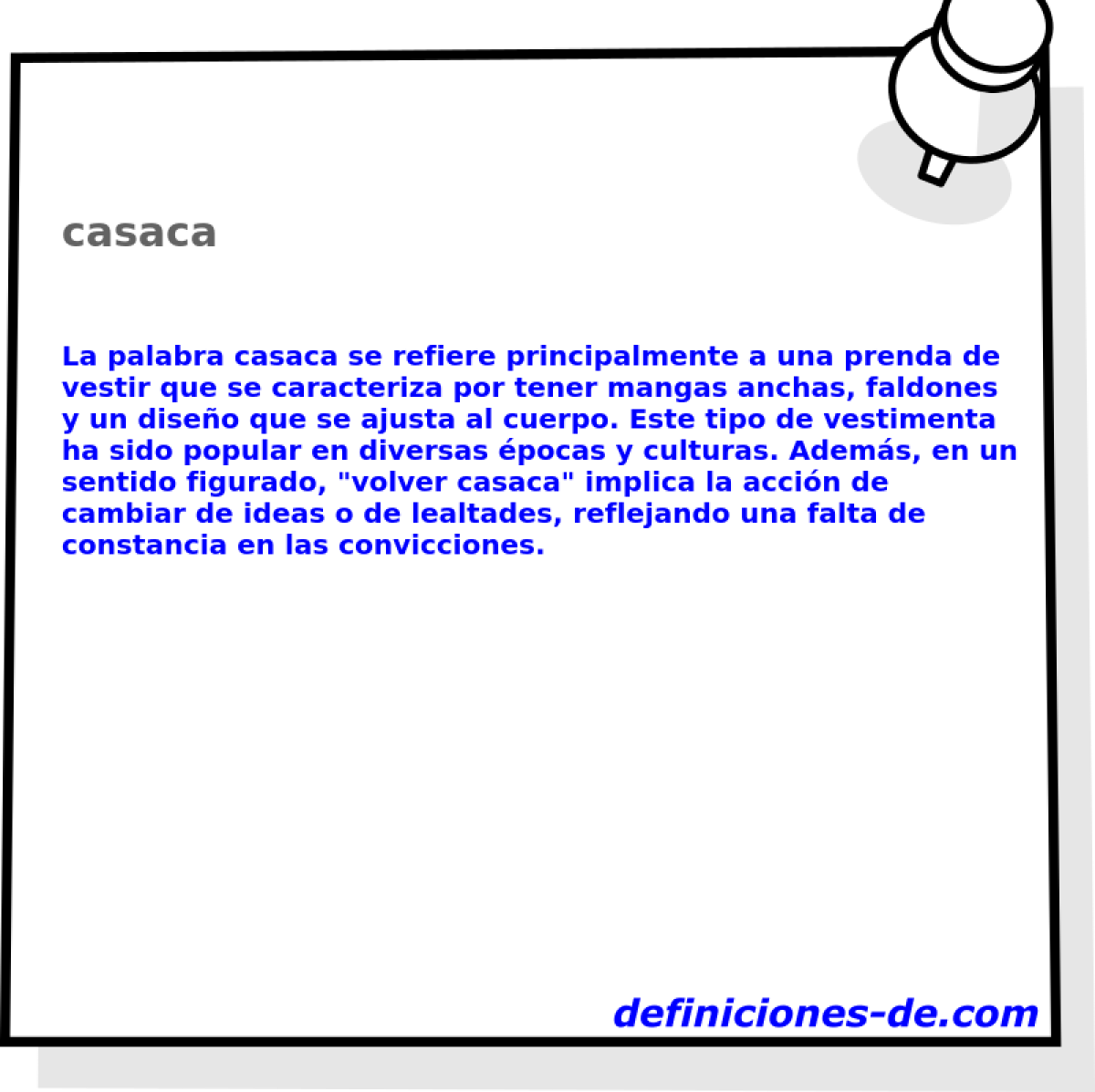 La palabra casaca se refiere principalmente a una prenda de vestir que se caracteriza por tener mangas anchas, faldones y un diseño que se ajusta al cuerpo.