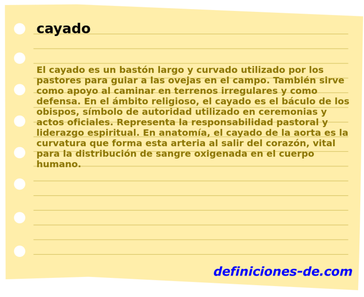 "El cayado del obispo estaba adornado con detalles dorados y piedras preciosas". - (cayado de la aorta) Anat. Curva que forma esta arteria al salir del corazón.