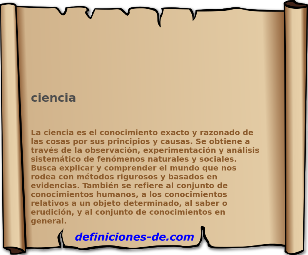 La ciencia es el conocimiento exacto y razonado de las cosas por sus principios y causas. Es un conjunto de conocimientos que se obtienen a través de la observación, experimentación y análisis sistemático de fenómenos naturales y sociales.