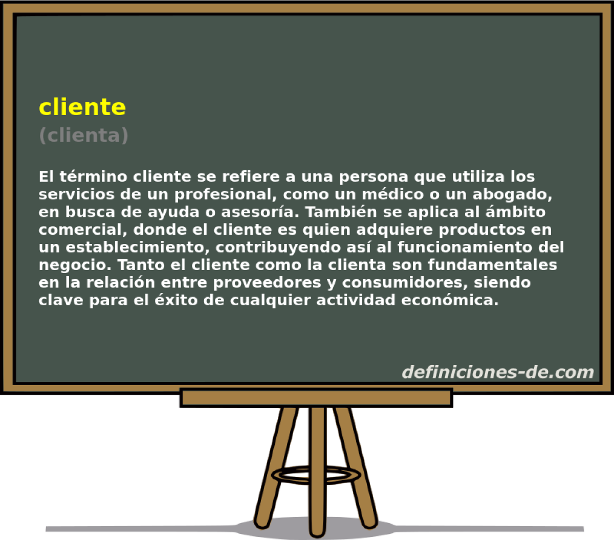 Más abreviaturas...Cómo citar la definición de clienteDefiniciones-de.com (2010). Definición de cliente - Leandro Alegsa © 20/06/2010 url: https://www.definiciones-de.com/Definicion/de/cliente.php
