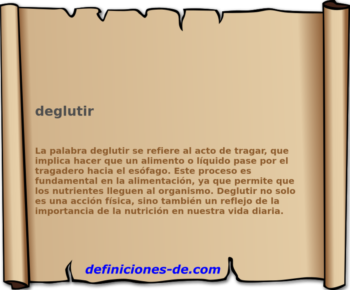 Más abreviaturas...Cómo citar la definición de deglutirDefiniciones-de.com (2016). Definición de deglutir - Leandro Alegsa © 31/05/2016 url: https://www.definiciones-de.com/Definicion/de/deglutir.php