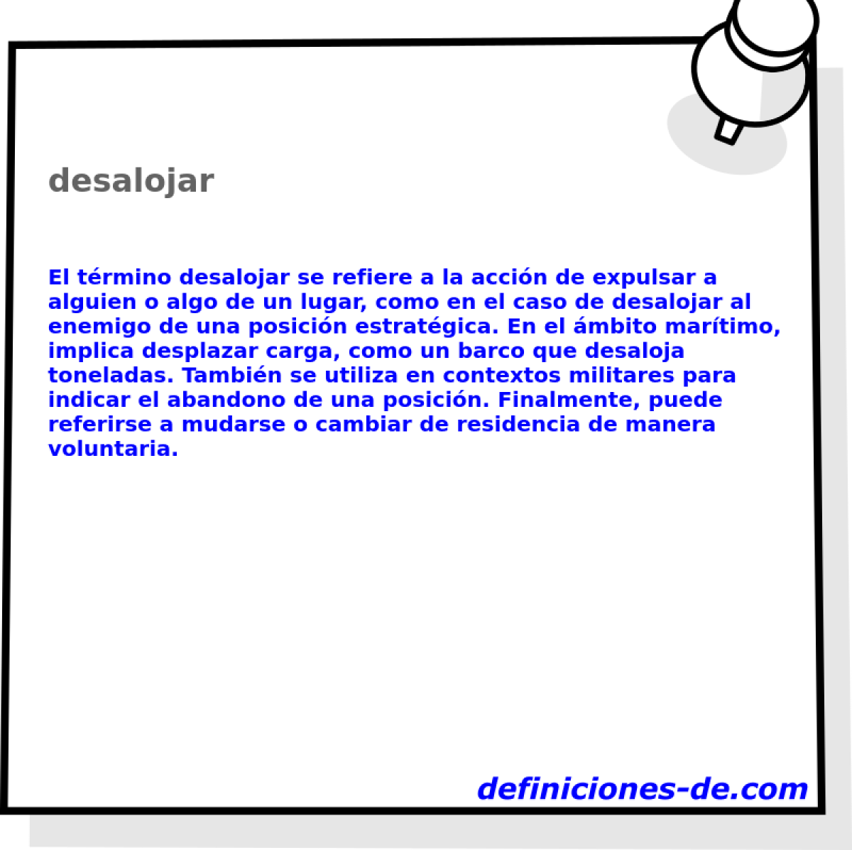 El término desalojar se refiere a la acción de expulsar a alguien o algo de un lugar, como en el caso de desalojar al enemigo de una posición estratégica.