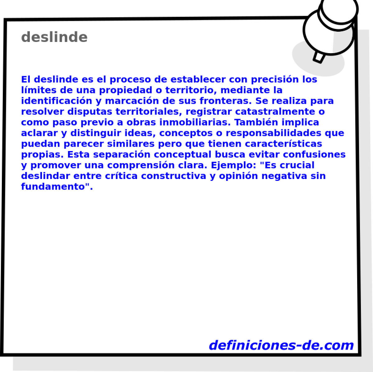 "Después de años de disputas por los límites de sus propiedades, los vecinos finalmente acordaron realizar un deslinde oficial." - Clarificación, aclaración o distinción entre ideas, conceptos o responsabilidades que pueden parecer similares o estar entrelazadas, pero que en realidad poseen características propias que las diferencian.