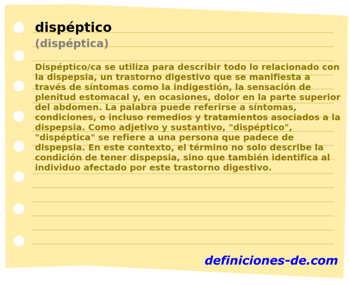 La palabra "dispéptico/a" puede referirse a síntomas, condiciones, o incluso remedios y tratamientos asociados a la dispepsia.