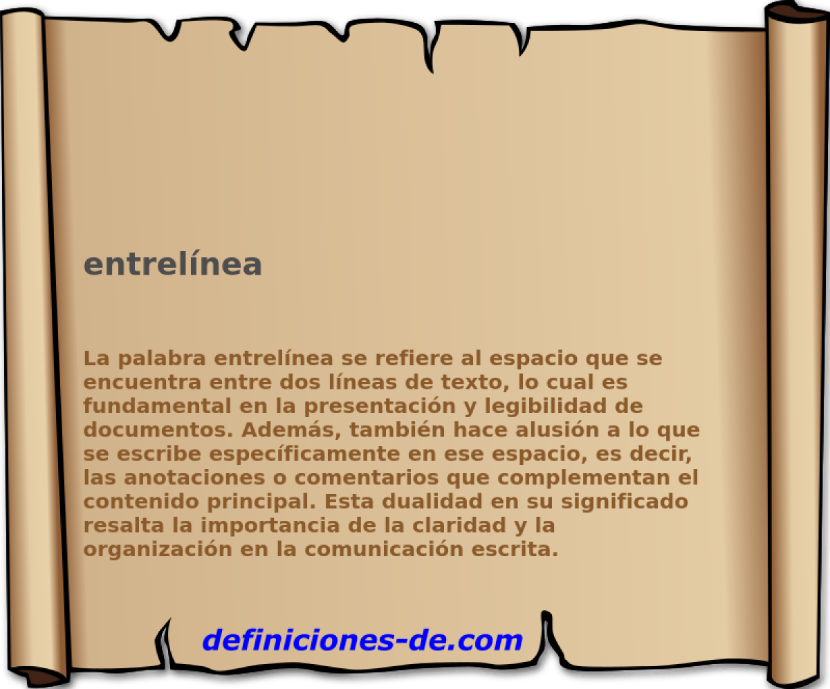 Posibles palabras o artículos relacionadosAbreviaturas empleadas en la definiciónCómo citar la definición de entrelíneaDefiniciones-de.com (2010). Definición de entrelínea - Leandro Alegsa © 17/07/2010 url: https://www.definiciones-de.com/Definicion/de/entrelinea.php