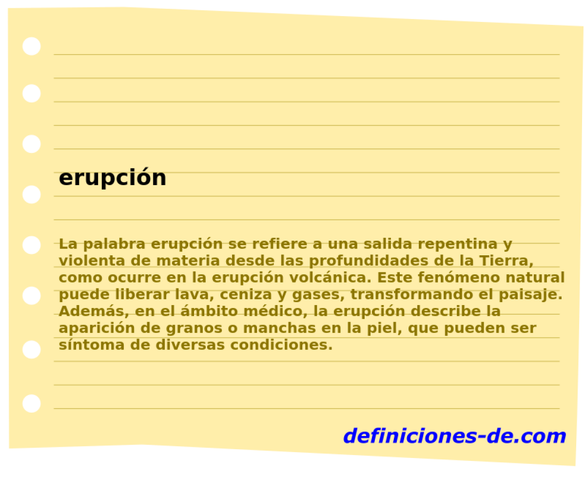 Más abreviaturas...Cómo citar la definición de erupciónDefiniciones-de.com (2010). Definición de erupción - Leandro Alegsa © 12/08/2010 url: https://www.definiciones-de.com/Definicion/de/erupcion.php