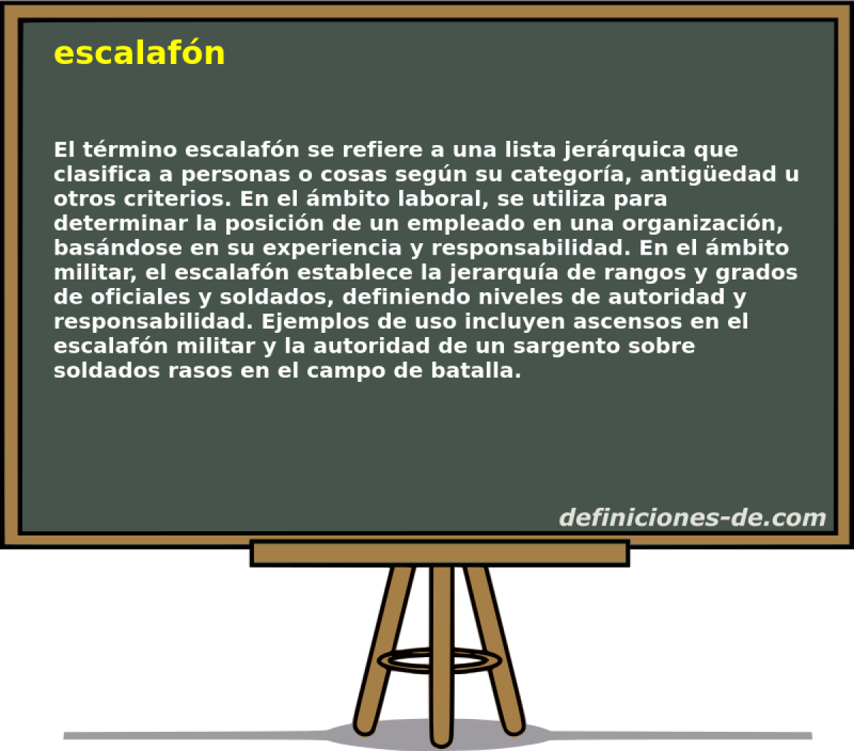 En el ámbito laboral, el escalafón se utiliza para determinar el rango o posición de un empleado dentro de una organización, generalmente basado en su nivel de experiencia y responsabilidad.