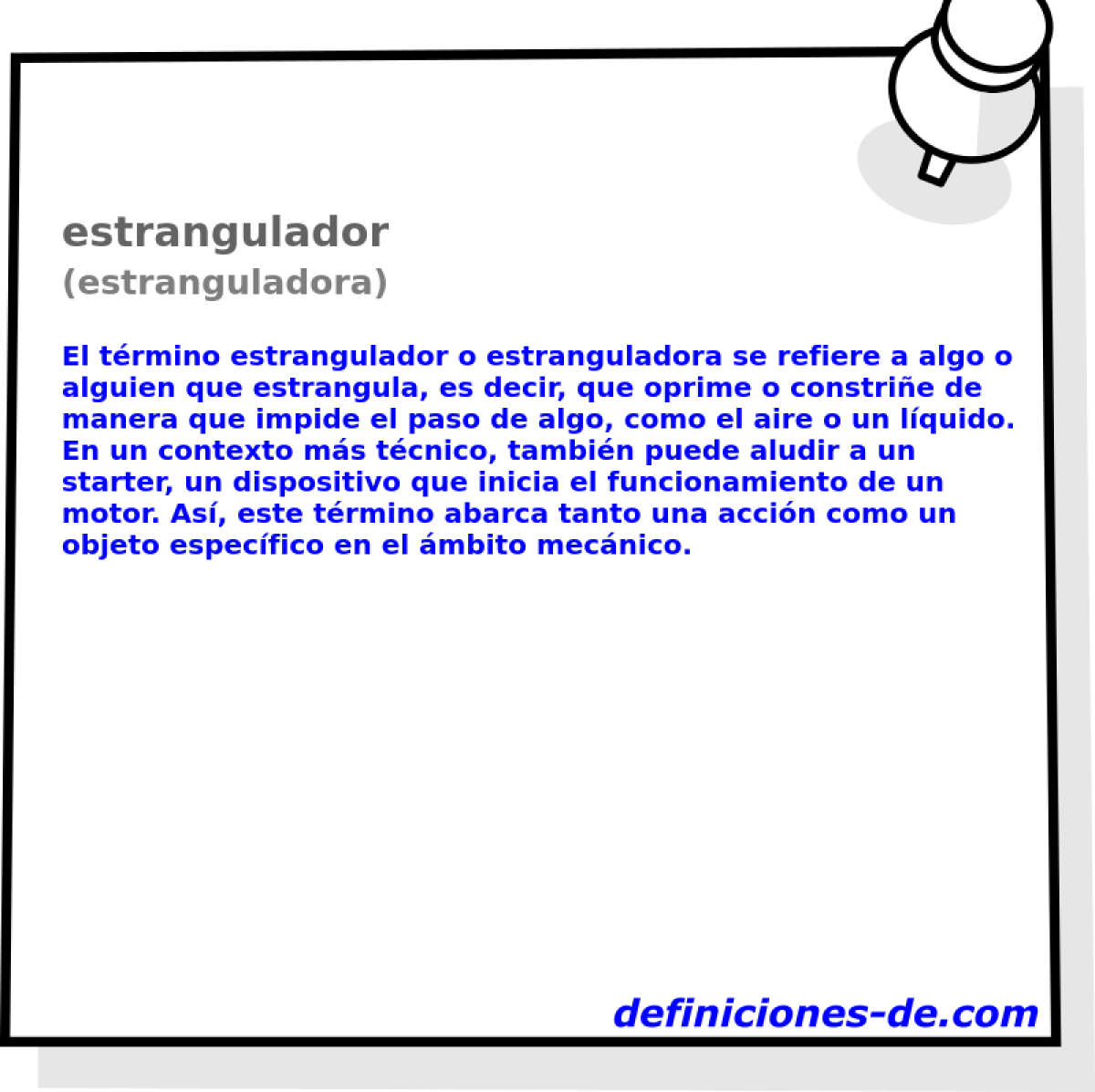 El término estrangulador o estranguladora se refiere a algo o alguien que estrangula, es decir, que oprime o constriñe de manera que impide el paso de algo, como el aire o un líquido.