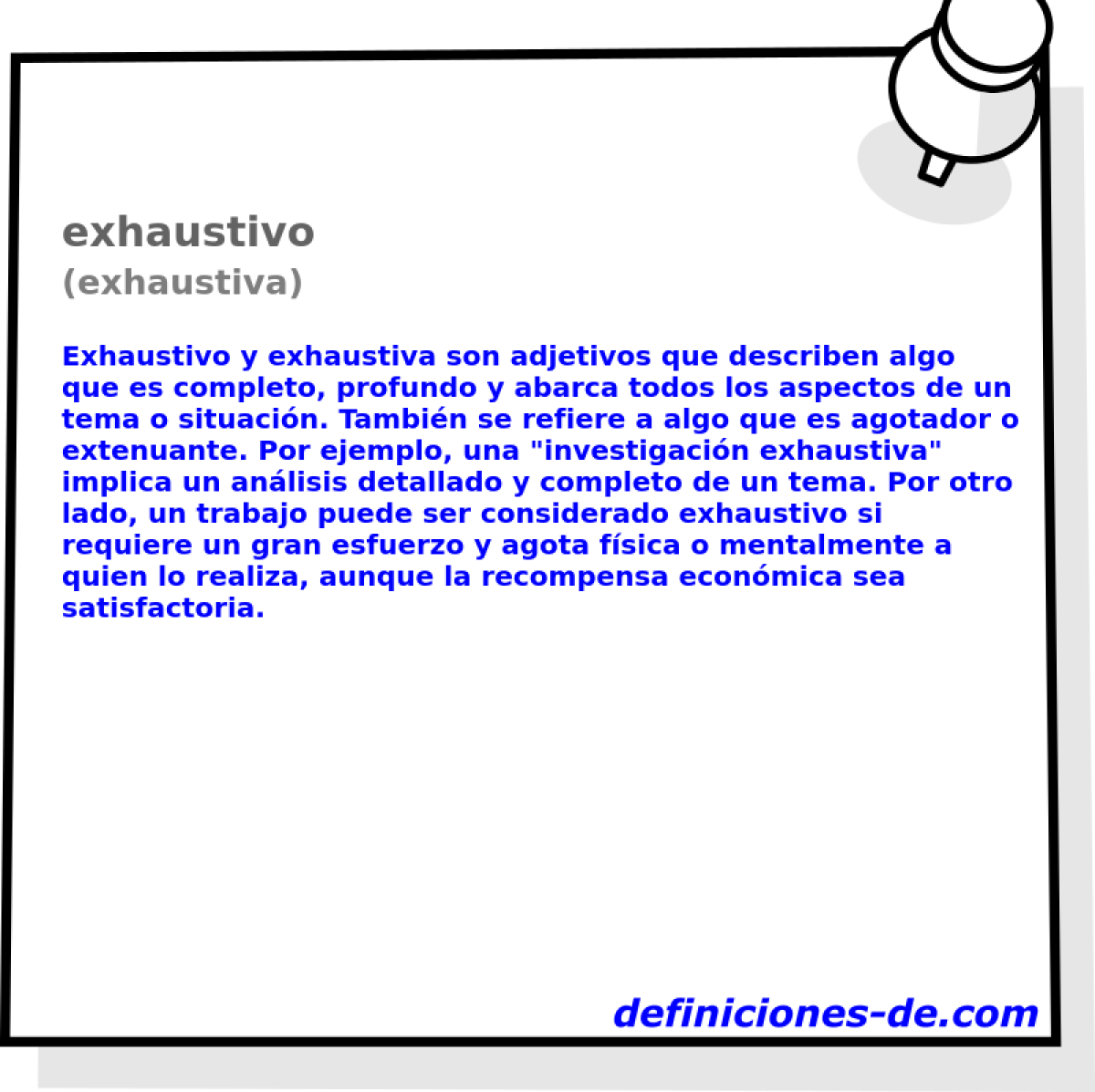 Exhaustivo y exhaustiva son adjetivos que describen algo que es completo, profundo y abarca todos los aspectos de un tema o situación.