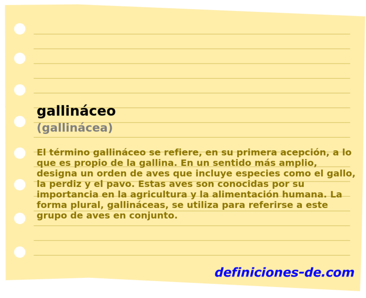 Más abreviaturas...Cómo citar la definición de gallináceoDefiniciones-de.com (2010). Definición de gallináceo - Leandro Alegsa © 17/08/2010 url: https://www.definiciones-de.com/Definicion/de/gallinaceo.php