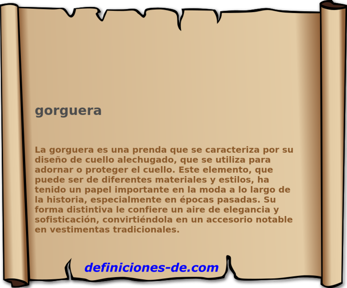Más abreviaturas...Cómo citar la definición de gorgueraDefiniciones-de.com (2010). Definición de gorguera - Leandro Alegsa © 25/08/2010 url: https://www.definiciones-de.com/Definicion/de/gorguera.php