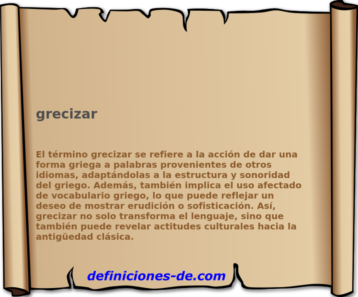 El término grecizar se refiere a la acción de dar una forma griega a palabras provenientes de otros idiomas, adaptándolas a la estructura y sonoridad del griego.