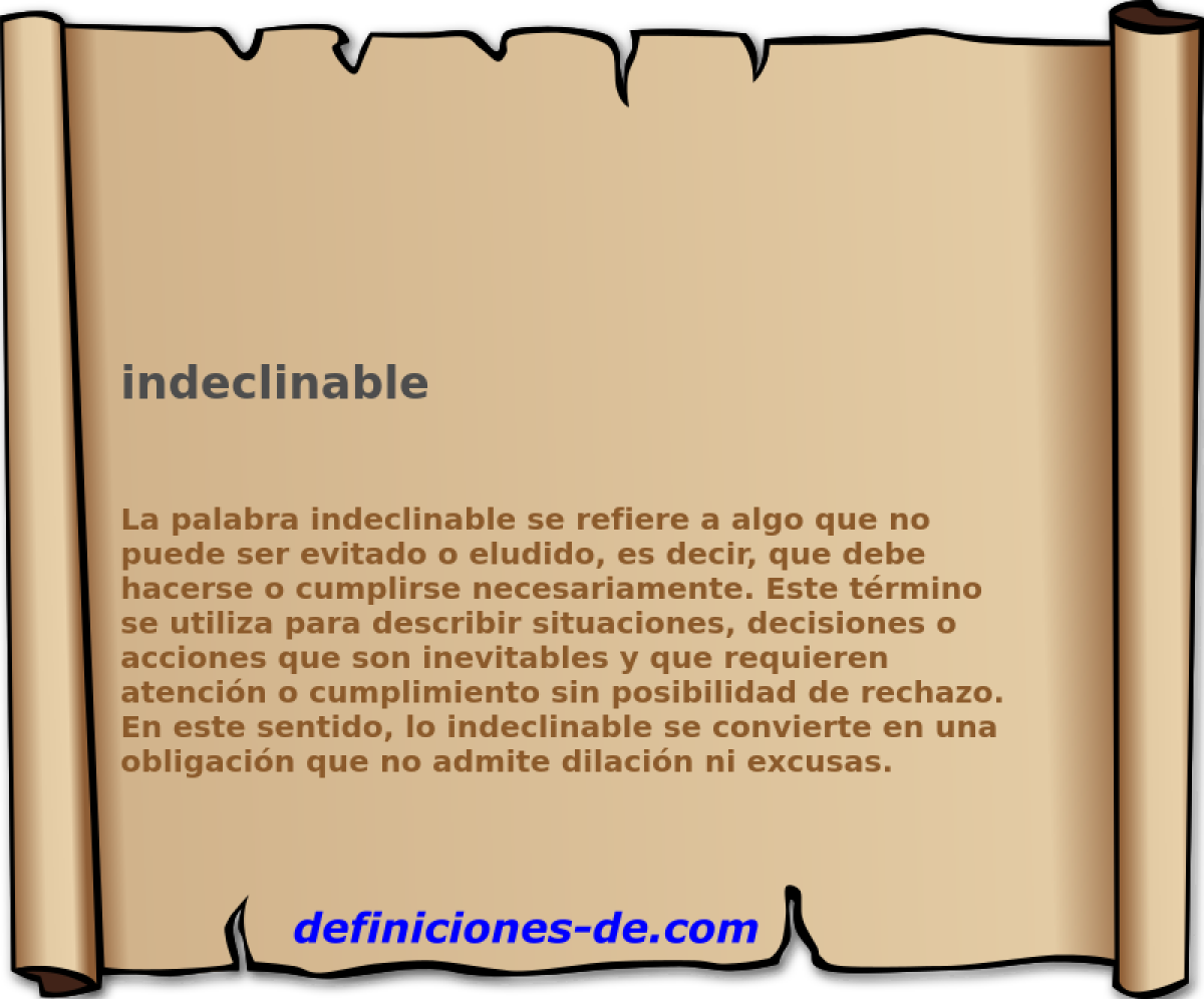 La palabra indeclinable se refiere a algo que no puede ser evitado o eludido, es decir, que debe hacerse o cumplirse necesariamente.