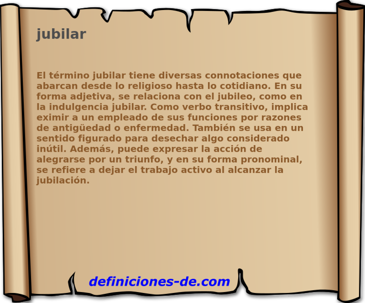 Más abreviaturas...Cómo citar la definición de jubilarDefiniciones-de.com (2010). Definición de jubilar - Leandro Alegsa © 29/08/2010 url: https://www.definiciones-de.com/Definicion/de/jubilar.php