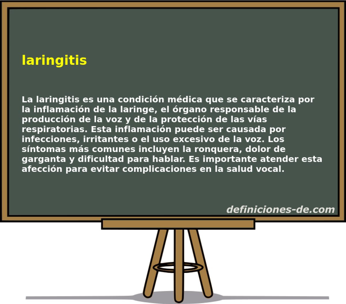 Más abreviaturas...Cómo citar la definición de laringitisDefiniciones-de.com (2010). Definición de laringitis - Leandro Alegsa © 29/08/2010 url: https://www.definiciones-de.com/Definicion/de/laringitis.php