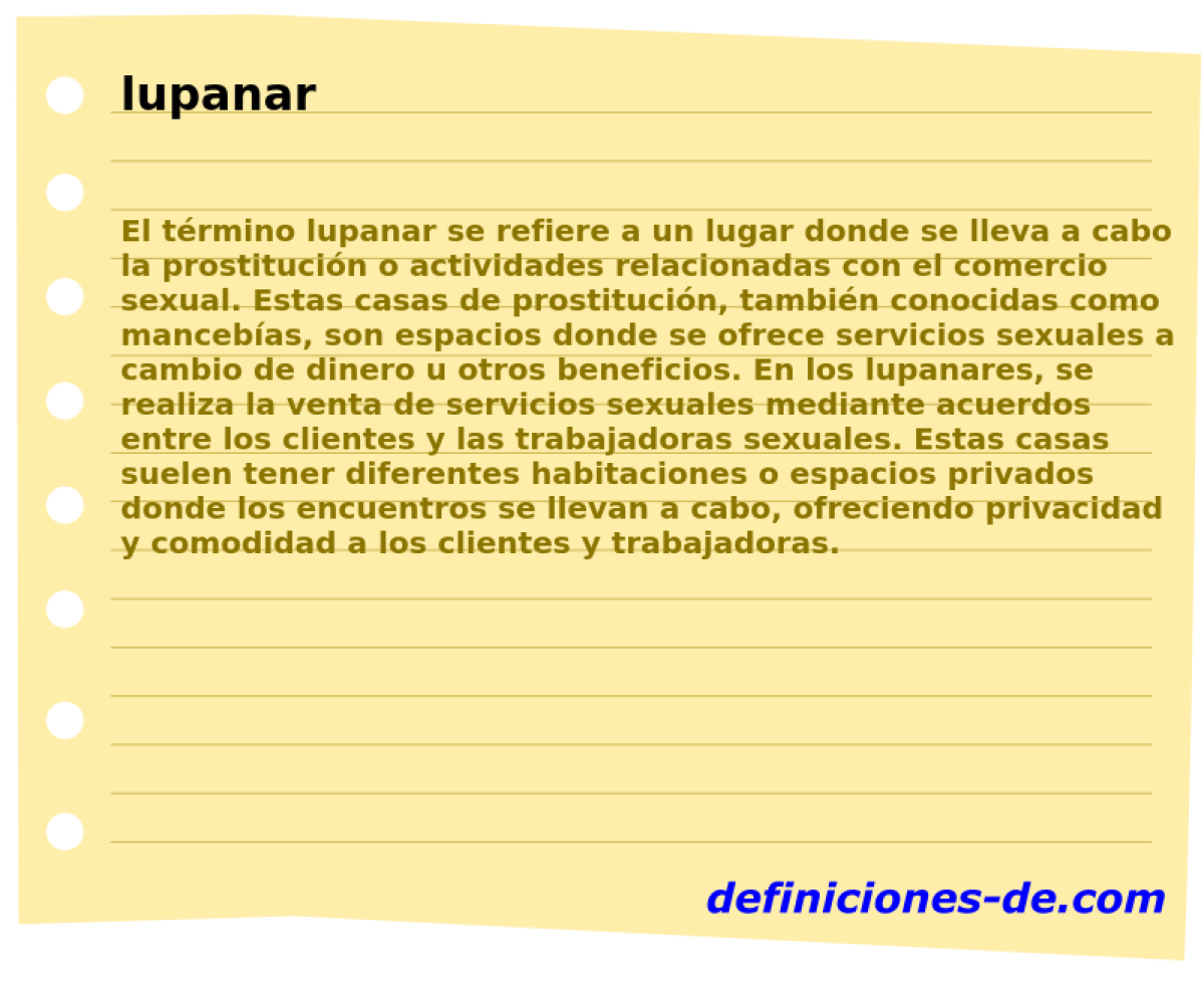 Más abreviaturas...Cómo citar la definición de lupanarDefiniciones-de.com (2023). Definición de lupanar - Leandro Alegsa © 29/09/2023 url: https://www.definiciones-de.com/Definicion/de/lupanar.php