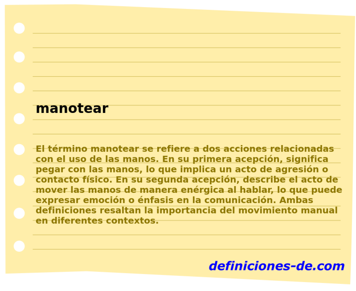 Más abreviaturas...Cómo citar la definición de manotearDefiniciones-de.com (2010). Definición de manotear - Leandro Alegsa © 31/08/2010 url: https://www.definiciones-de.com/Definicion/de/manotear.php