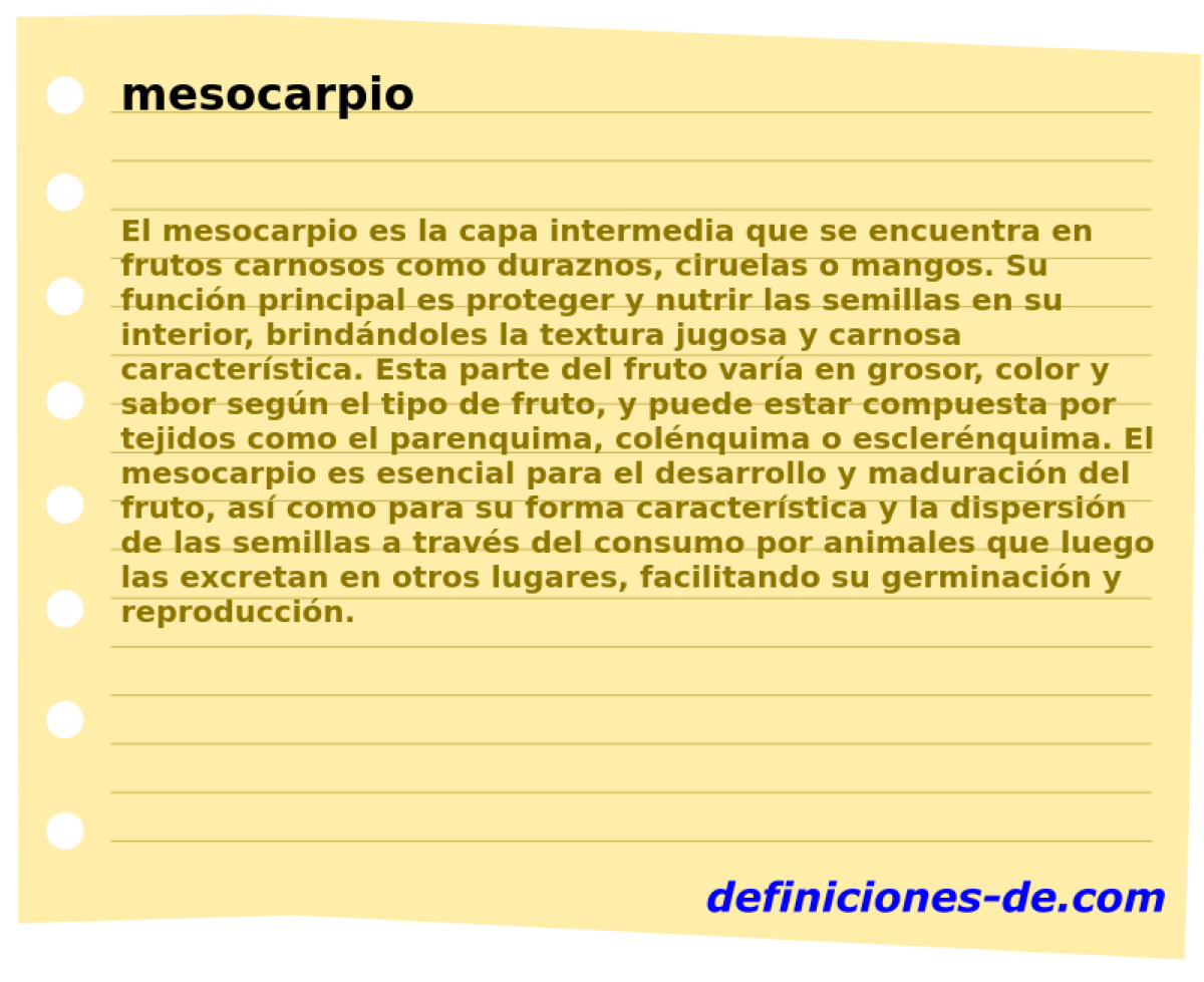 Más abreviaturas...Cómo citar la definición de mesocarpioDefiniciones-de.com (2023). Definición de mesocarpio - Leandro Alegsa © 15/11/2023 url: https://www.definiciones-de.com/Definicion/de/mesocarpio.php