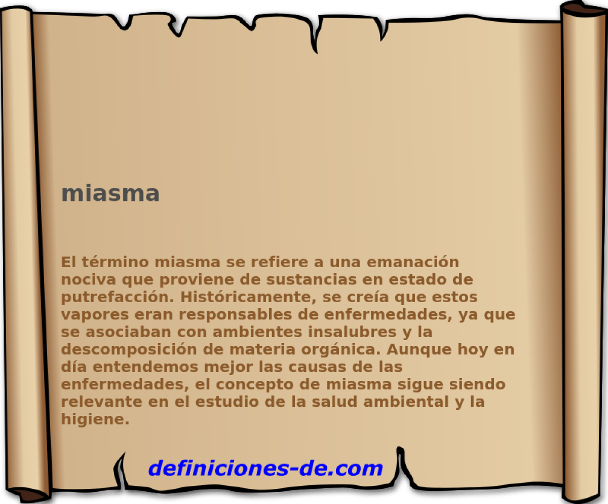 Más abreviaturas...Cómo citar la definición de miasmaDefiniciones-de.com (2010). Definición de miasma - Leandro Alegsa © 31/08/2010 url: https://www.definiciones-de.com/Definicion/de/miasma.php