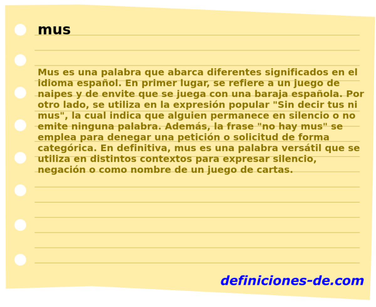 En definitiva, mus es una palabra versátil que se utiliza en distintos contextos para expresar silencio, negación o como nombre de un juego de cartas.