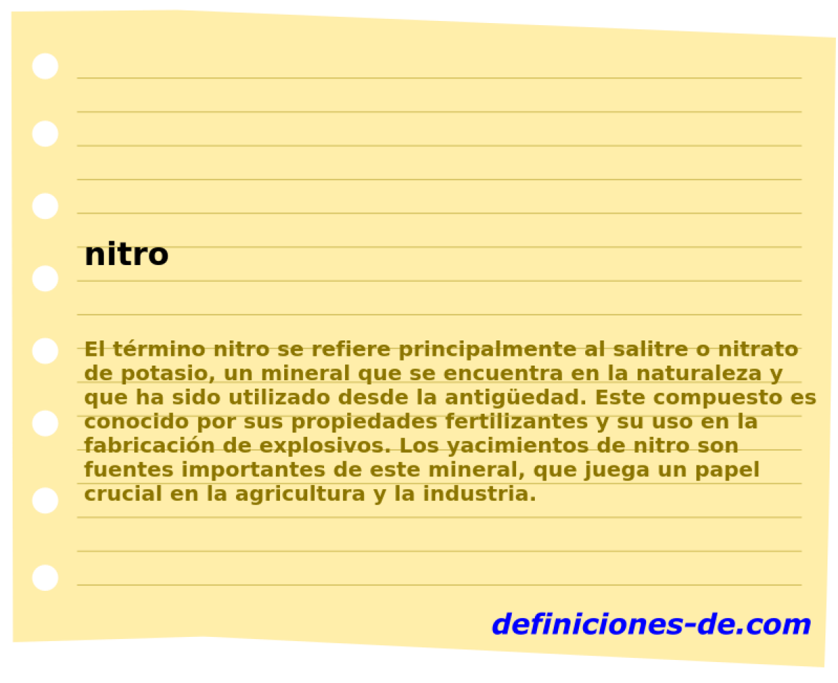 El término nitro se refiere principalmente al salitre o nitrato de potasio, un mineral que se encuentra en la naturaleza y que ha sido utilizado desde la antigüedad.