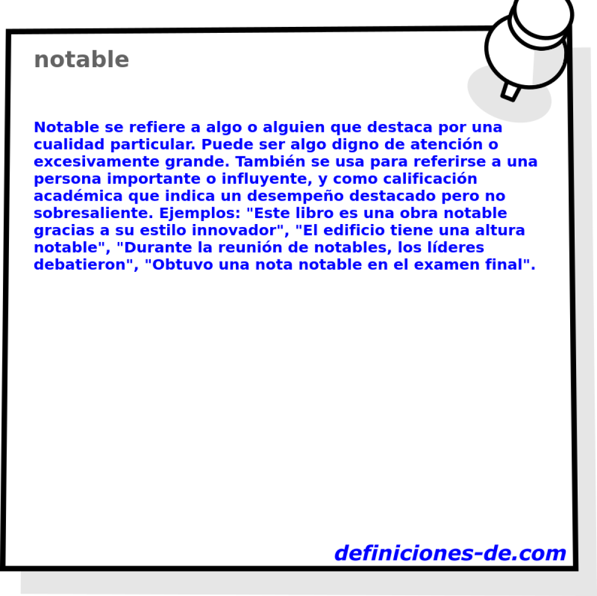 Ejemplos: "Este libro es una obra notable gracias a su estilo innovador", "El edificio tiene una altura notable", "Durante la reunión de notables, los líderes debatieron", "Obtuvo una nota notable en el examen final".
