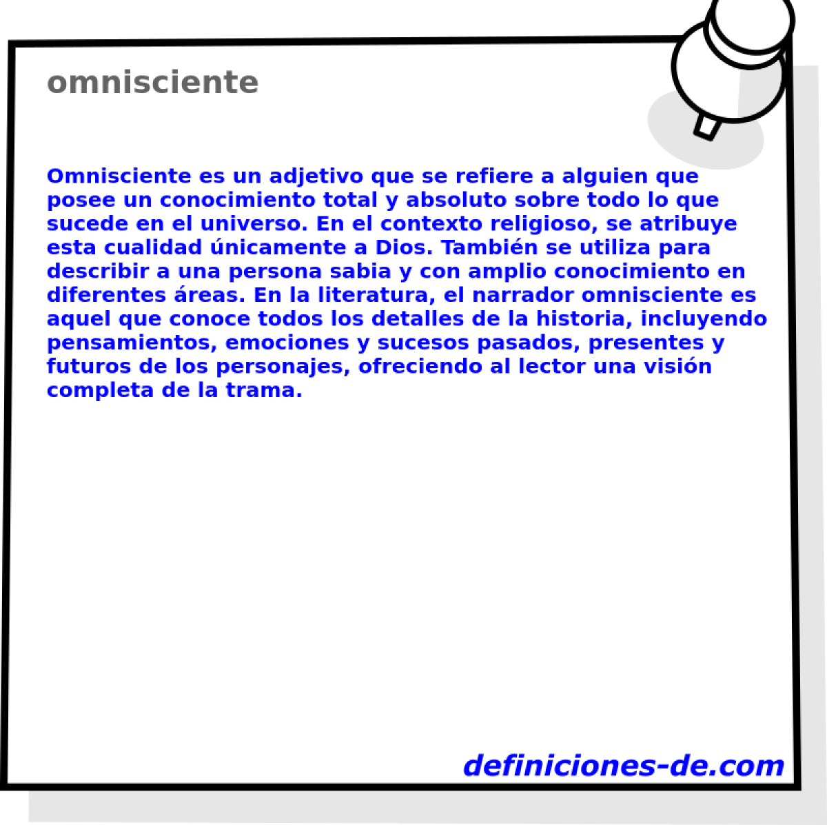 Más abreviaturas...Cómo citar la definición de omniscienteDefiniciones-de.com (2023). Definición de omnisciente - Leandro Alegsa © 13/07/2023 url: https://www.definiciones-de.com/Definicion/de/omnisciente.php