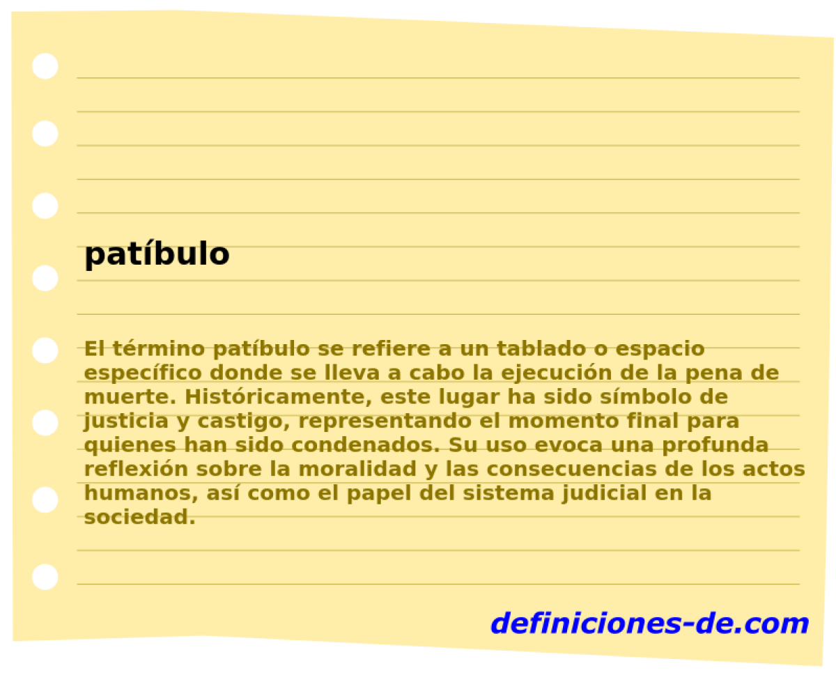 El término patíbulo se refiere a un tablado o espacio específico donde se lleva a cabo la ejecución de la pena de muerte.