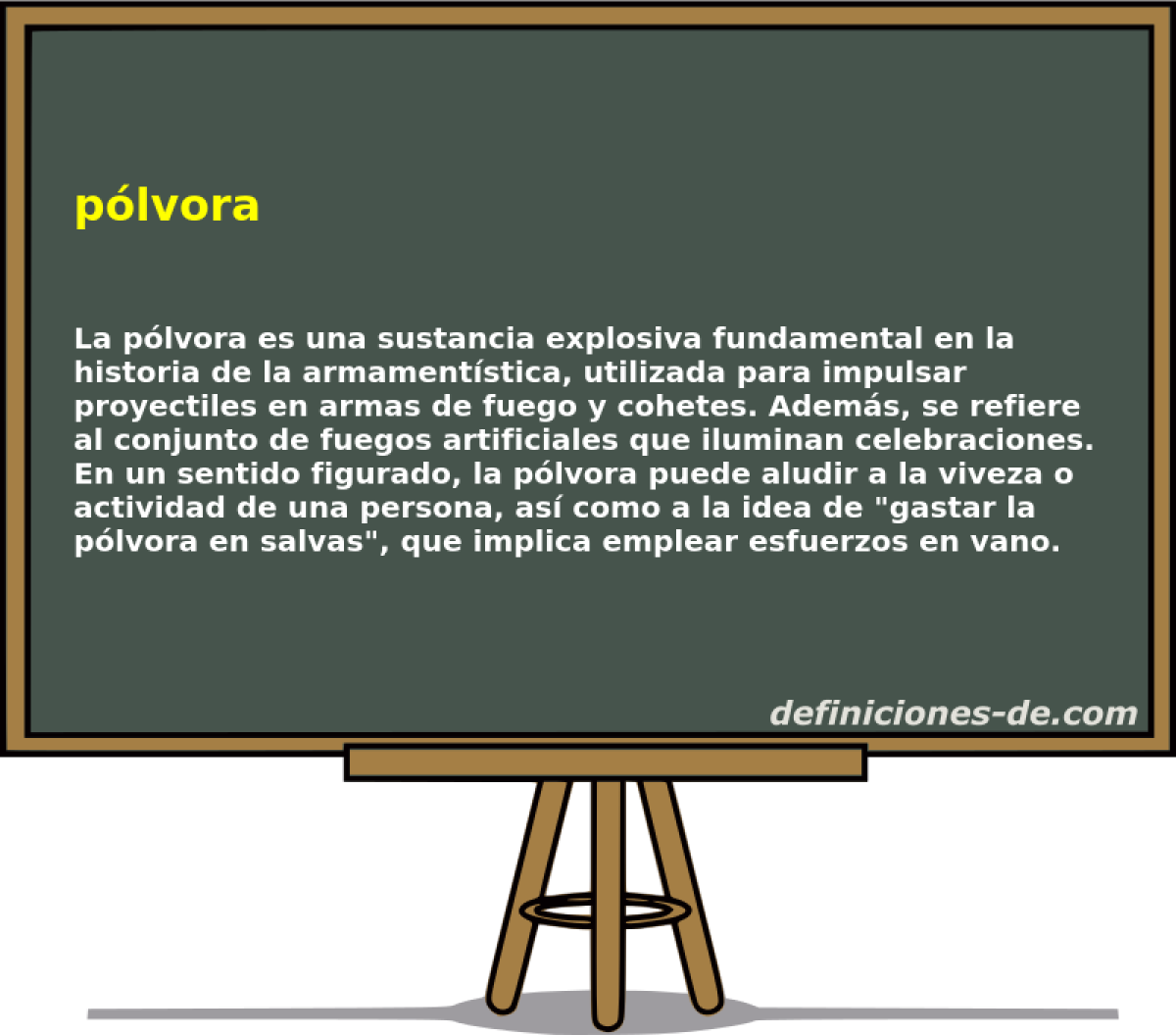 Abreviaturas empleadas en la definiciónCómo citar la definición de pólvoraDefiniciones-de.com (2010). Definición de pólvora - Leandro Alegsa © 03/09/2010 url: https://www.definiciones-de.com/Definicion/de/polvora.php
