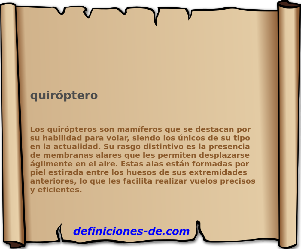 Más abreviaturas...Cómo citar la definición de quirópteroDefiniciones-de.com (2023). Definición de quiróptero - Leandro Alegsa © 23/10/2023 url: https://www.definiciones-de.com/Definicion/de/quiroptero.php