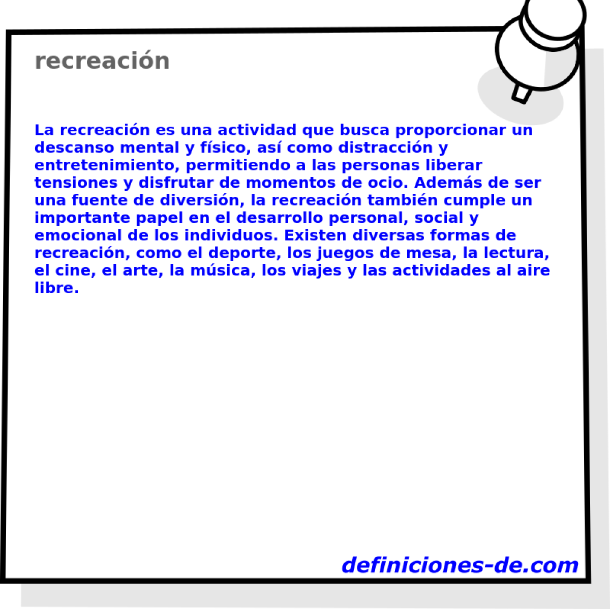 La recreación es una actividad que busca proporcionar un descanso mental y físico, así como distracción y entretenimiento, permitiendo a las personas liberar tensiones y disfrutar de momentos de ocio.