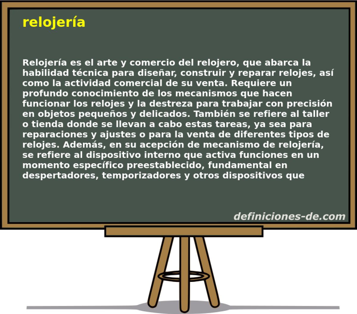 Esta acepción de "relojería" se refiere tanto a la habilidad y conocimiento técnico necesarios para diseñar, construir y reparar relojes como a la actividad comercial relacionada con la venta de relojes.
