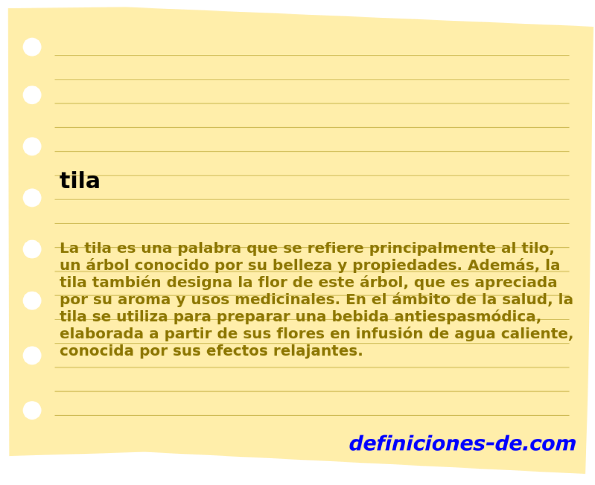 Más abreviaturas...Cómo citar la definición de tilaDefiniciones-de.com (2010). Definición de tila - Leandro Alegsa © 16/09/2010 url: https://www.definiciones-de.com/Definicion/de/tila.php