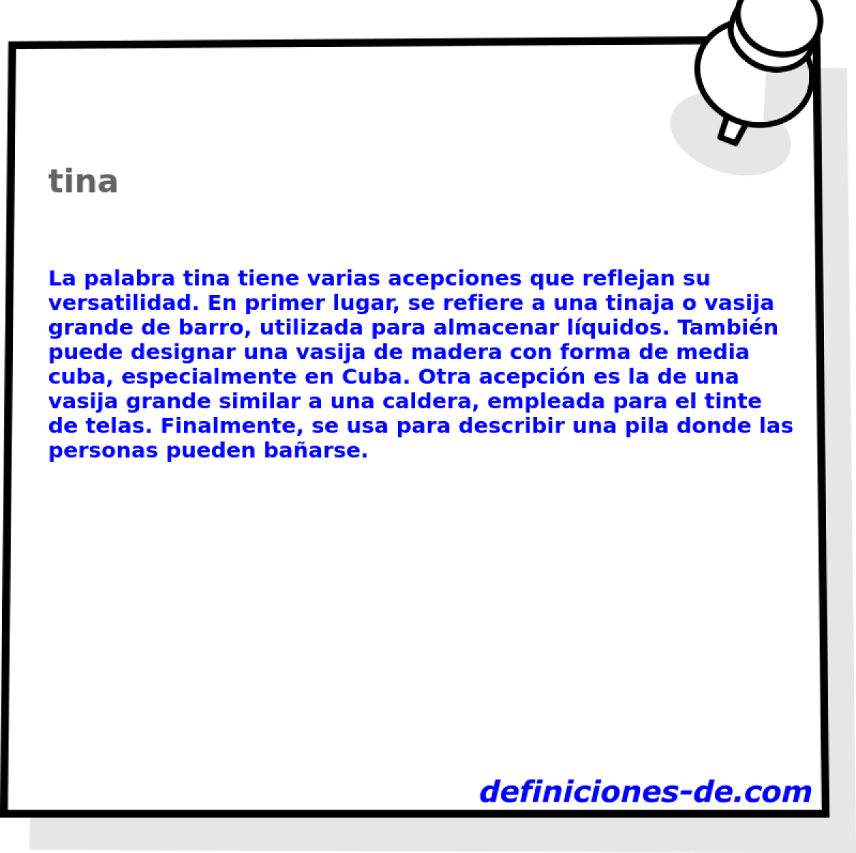Más abreviaturas...Cómo citar la definición de tinaDefiniciones-de.com (2010). Definición de tina - Leandro Alegsa © 16/09/2010 url: https://www.definiciones-de.com/Definicion/de/tina.php