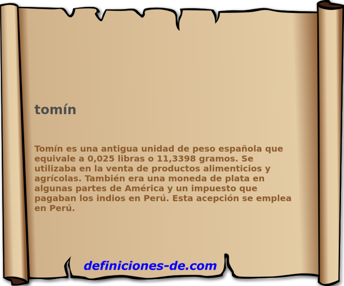 Tomín es una antigua unidad de peso española que equivale a 0,025 libras o 11,3398 gramos.