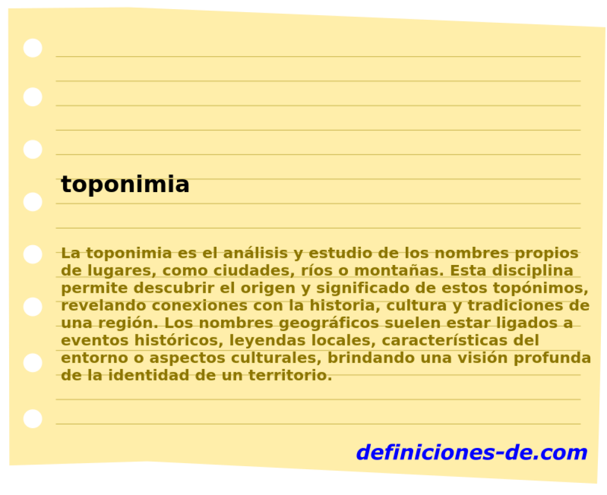 La toponimia es una disciplina que se encarga de investigar y analizar los nombres geográficos, es decir, los nombres propios de lugares como ciudades, pueblos, ríos, montañas, entre otros.
