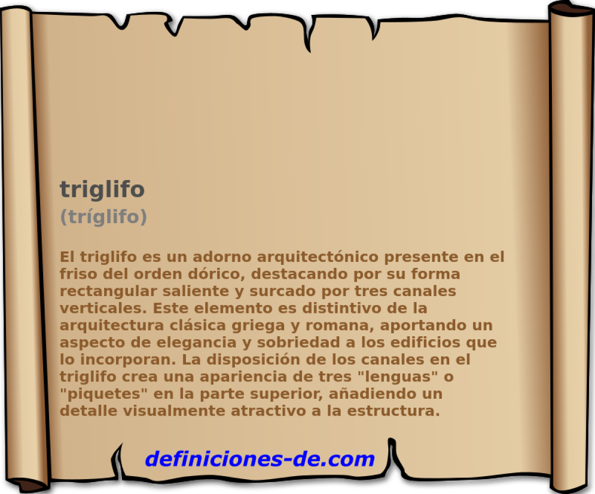 - Tríglifo. m. Arq. Miembro arquitectónico en forma de rectángulo saliente y con tres canales, que decora el friso del orden dórico desde el arquitrabe a la cornisa.