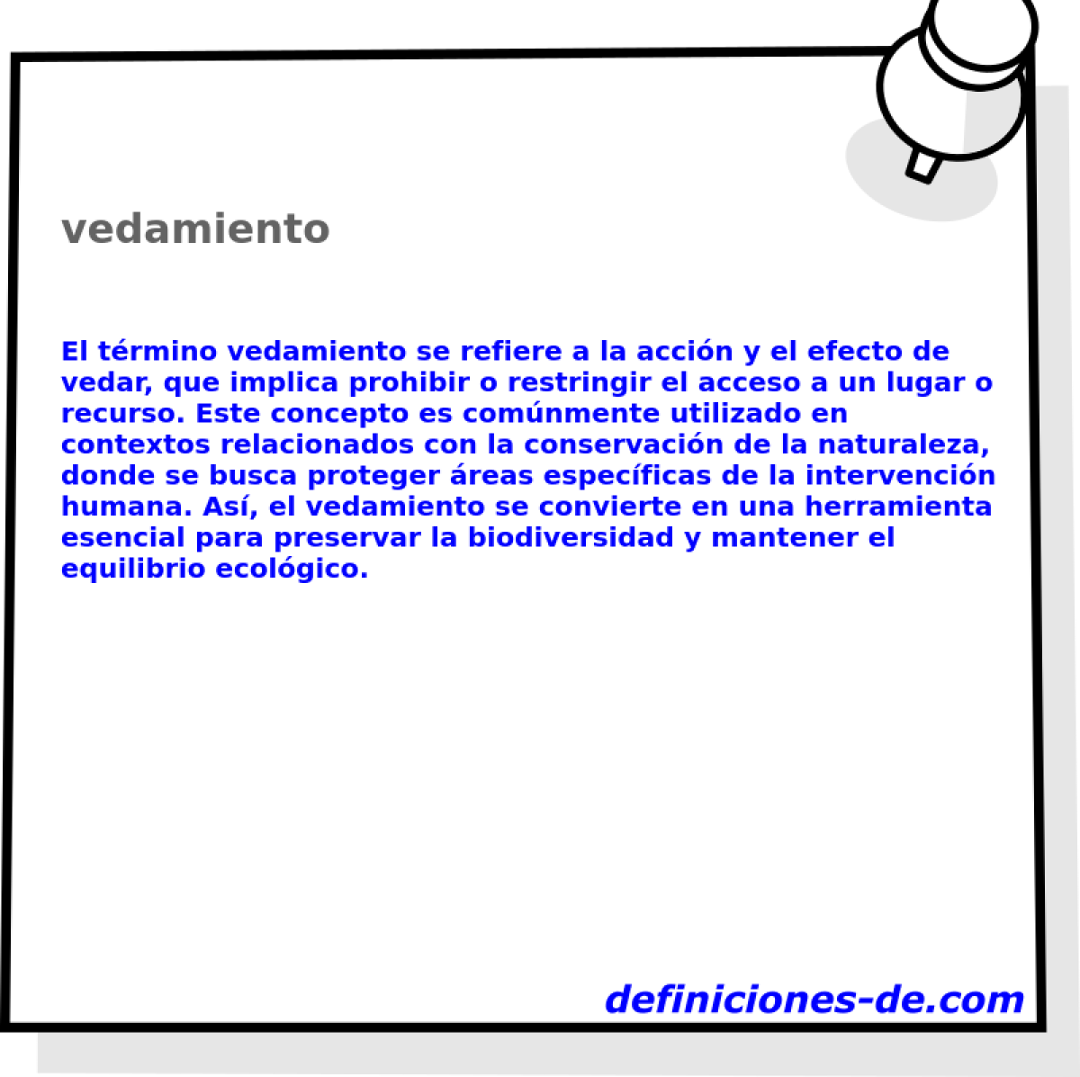 El término vedamiento se refiere a la acción y el efecto de vedar, que implica prohibir o restringir el acceso a un lugar o recurso.